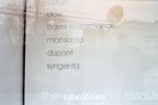 vinyl lettering installed in a public window space. words identify the "spelling of disaster". each of the 6 words identifies a multinational biotech company involved with the research, manufacture and promotion of genetically modifed biotechnology.